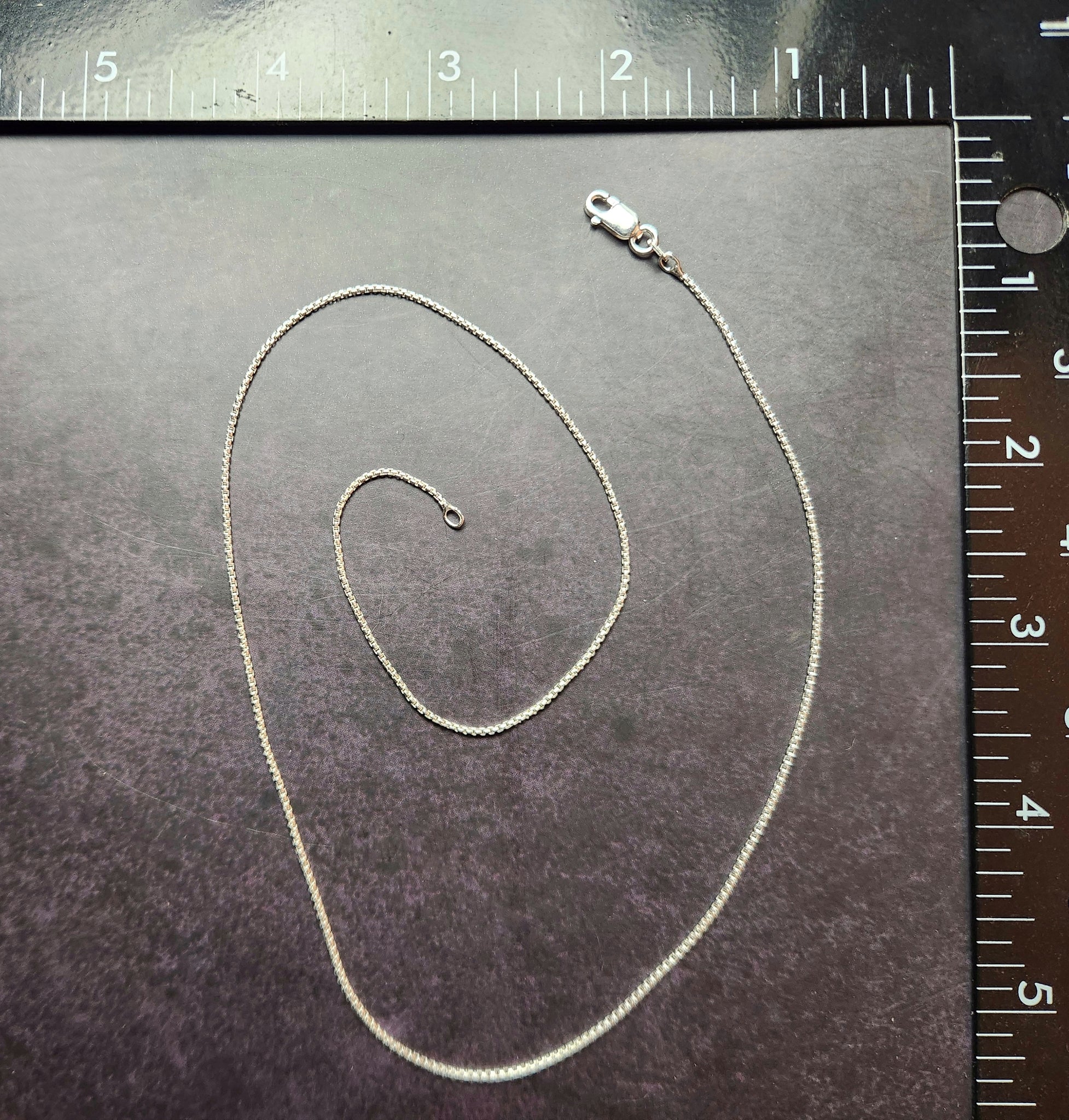 The chain here is 18" and 1.1mm wide, a rounded box chain that is my favorite style- super comfortable on the skin.