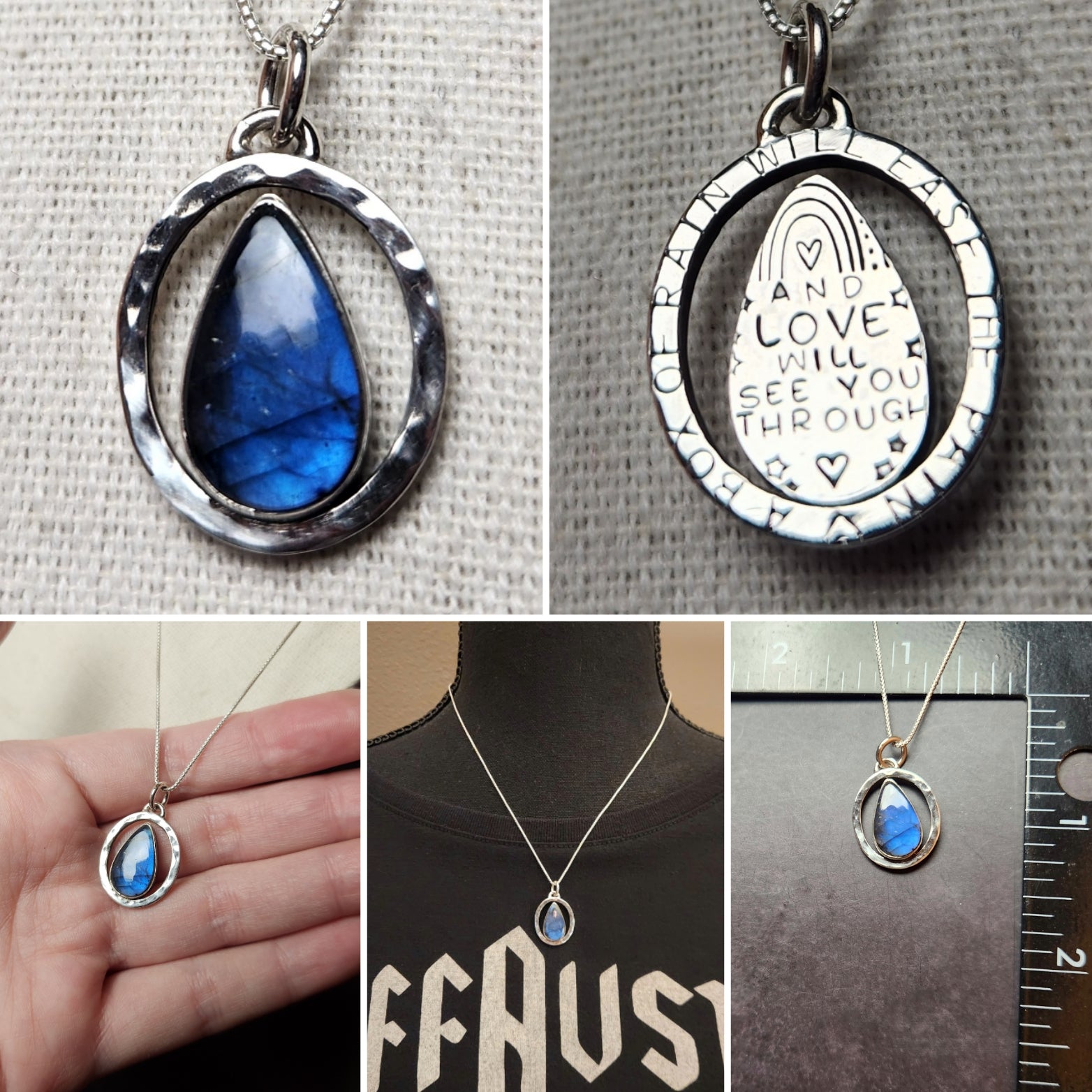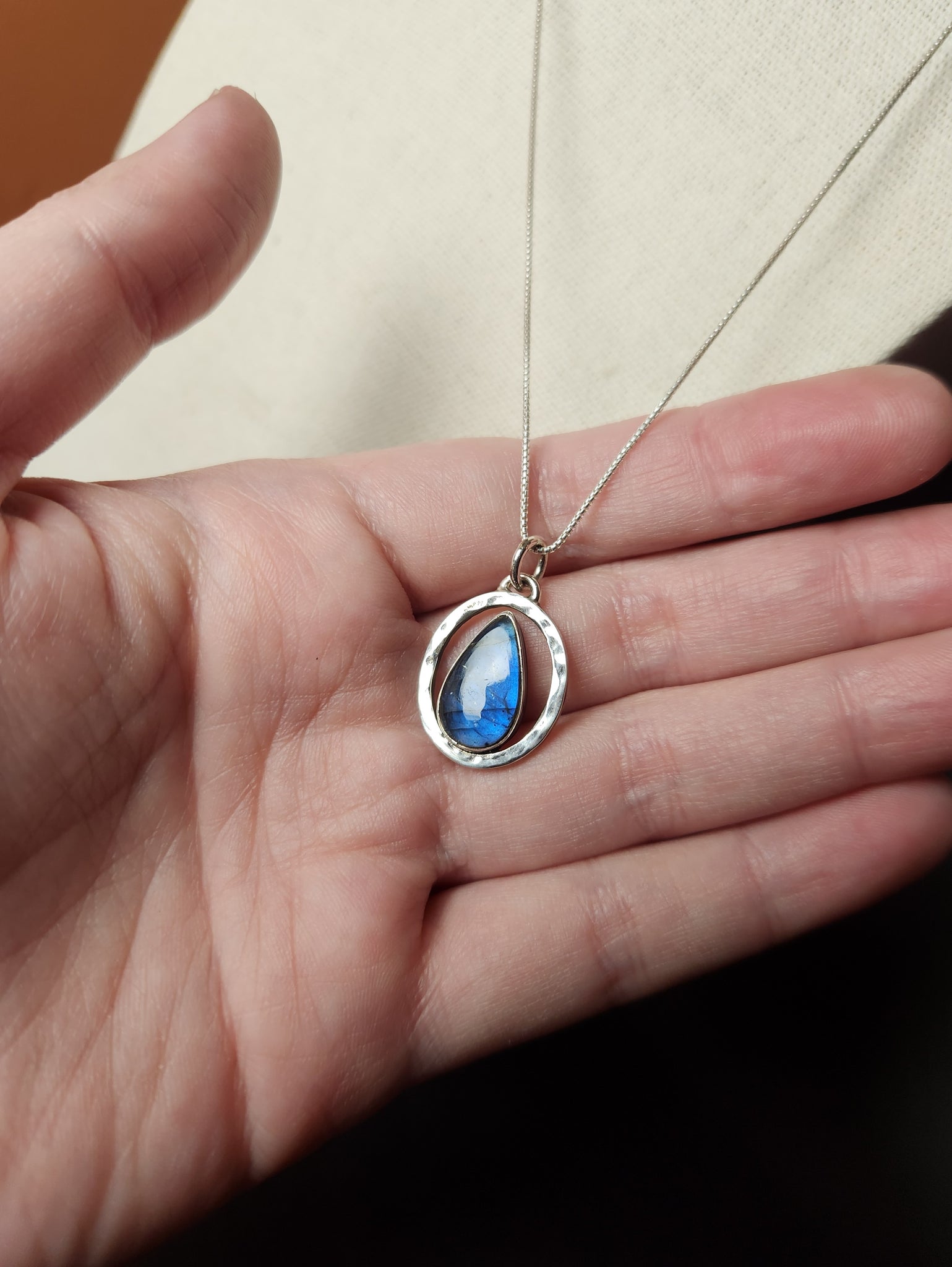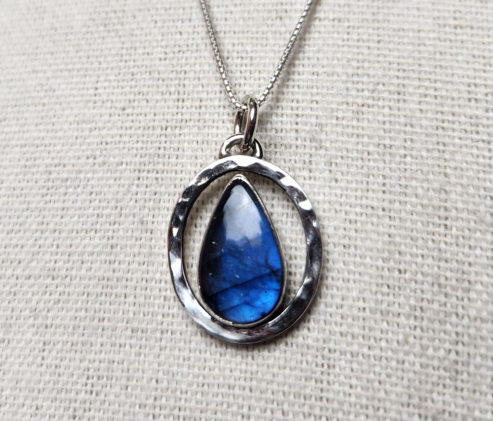 Raindrop-shaped labradorite with a beautiful bold blue flash when the light hits. Front of the frame as a hammered texture finish.