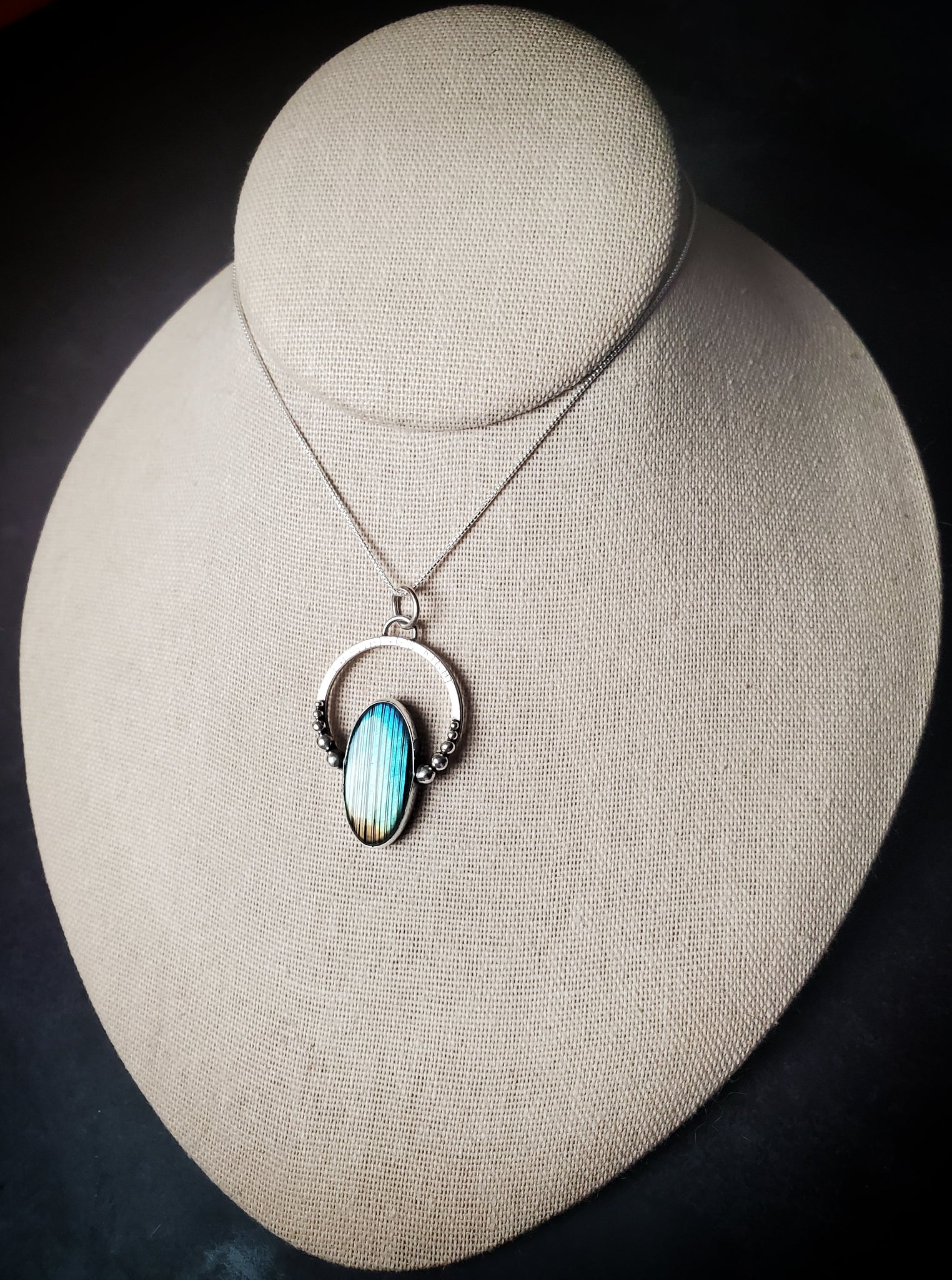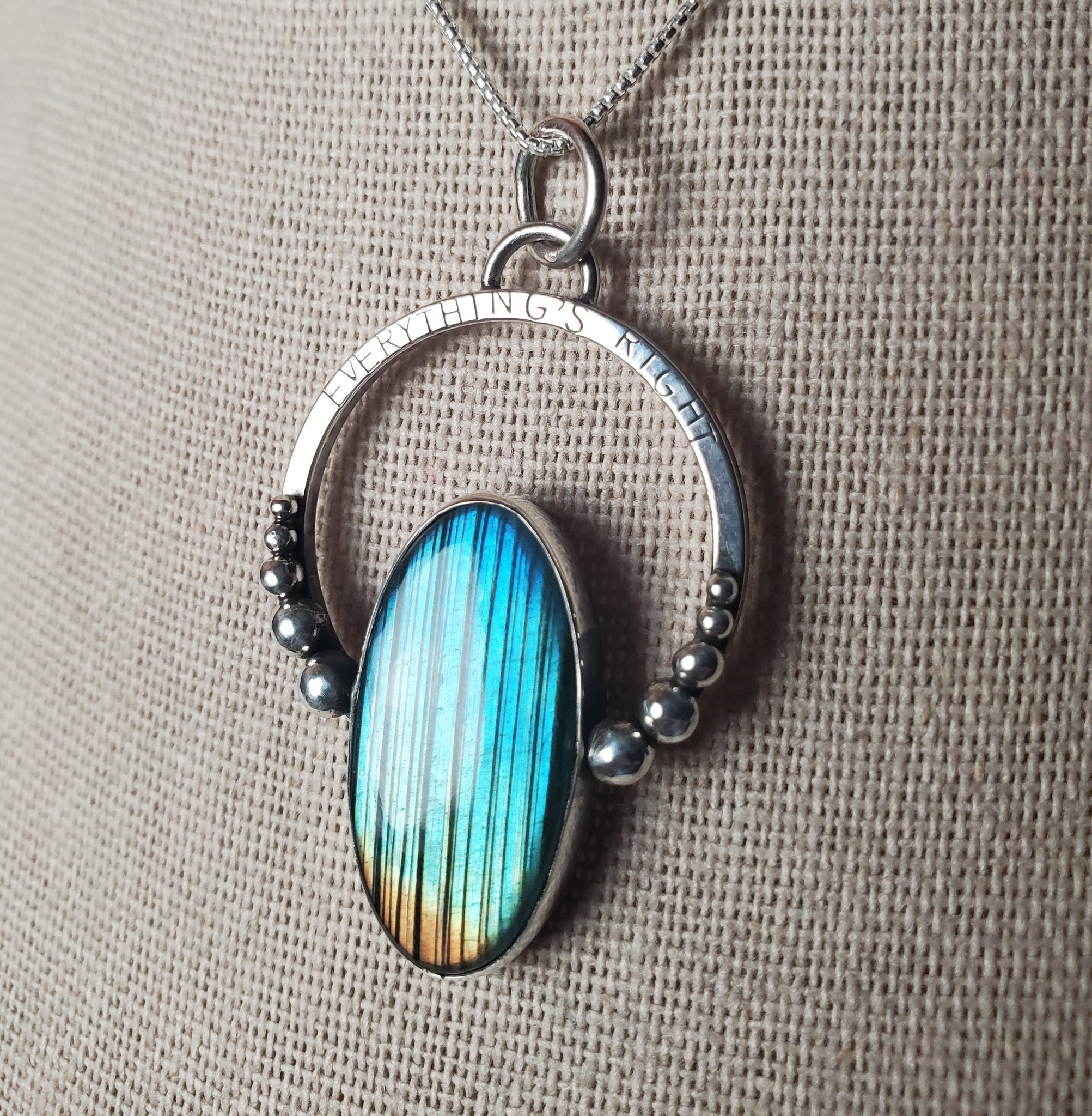 I'm so happy with how this one turned out. The labradorite has a very vivid teal flash with lines running through it- and just this hint of a golden sunrise-like coloring at the bottom. It felt like the perfect fit to pair with the Everything's Right lyric "the long night's over, and the sun's coming up".