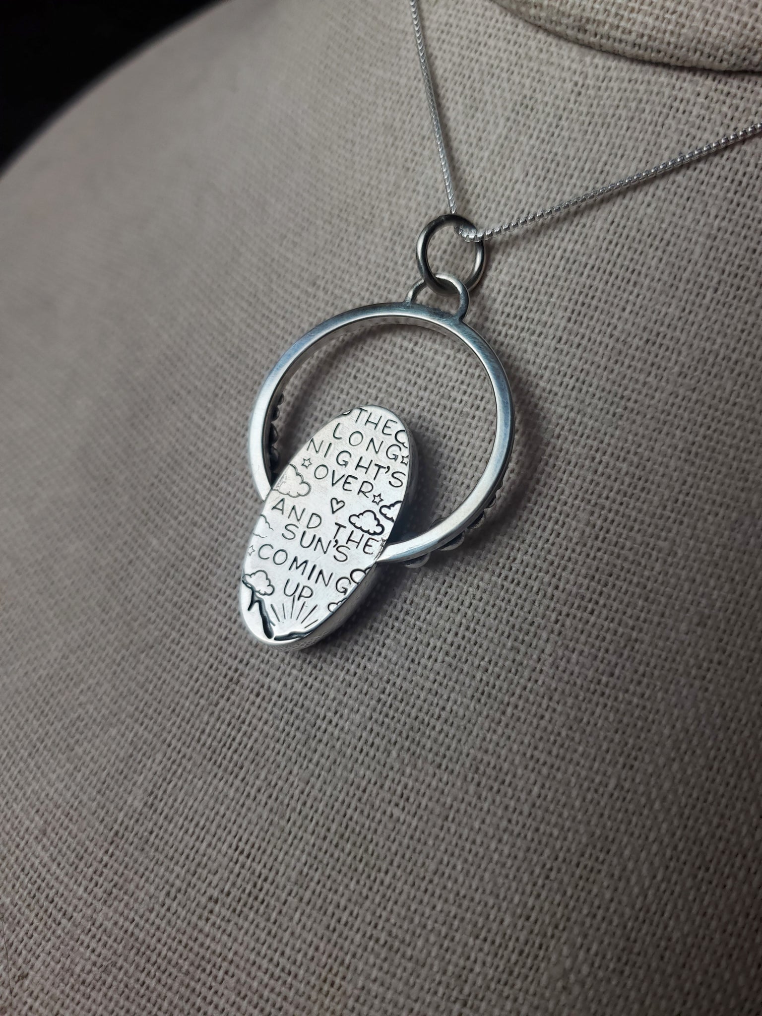The front has little accent balls I created from melting fine silver, and the top of the bail has a subtle "everything's right" hammered into it in a 1.5mm font.