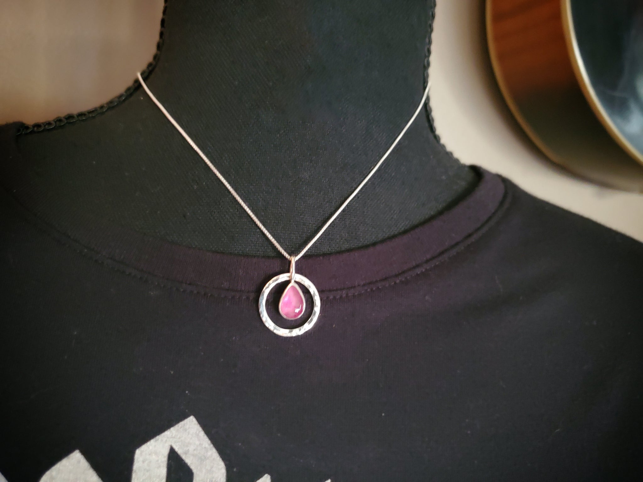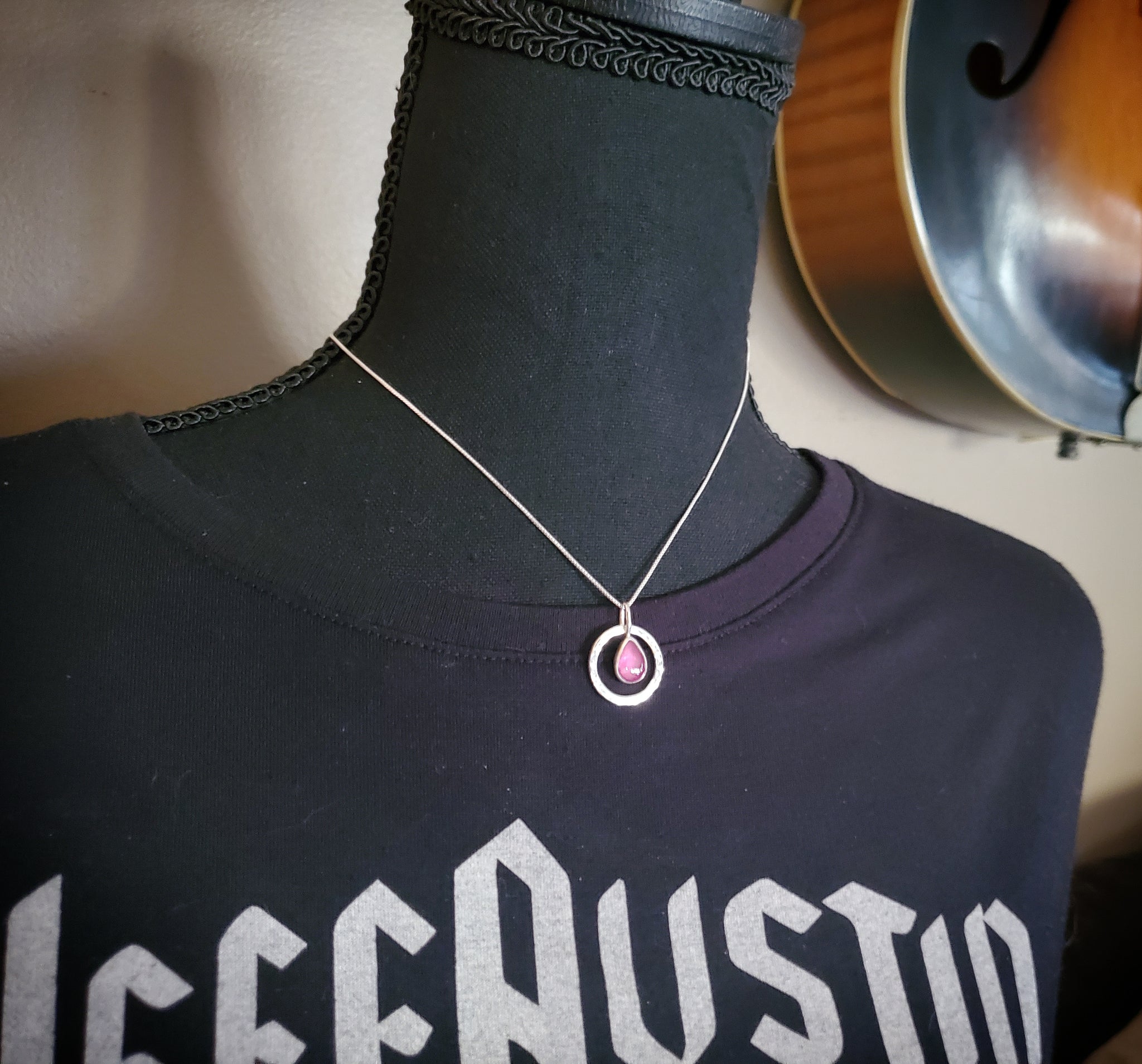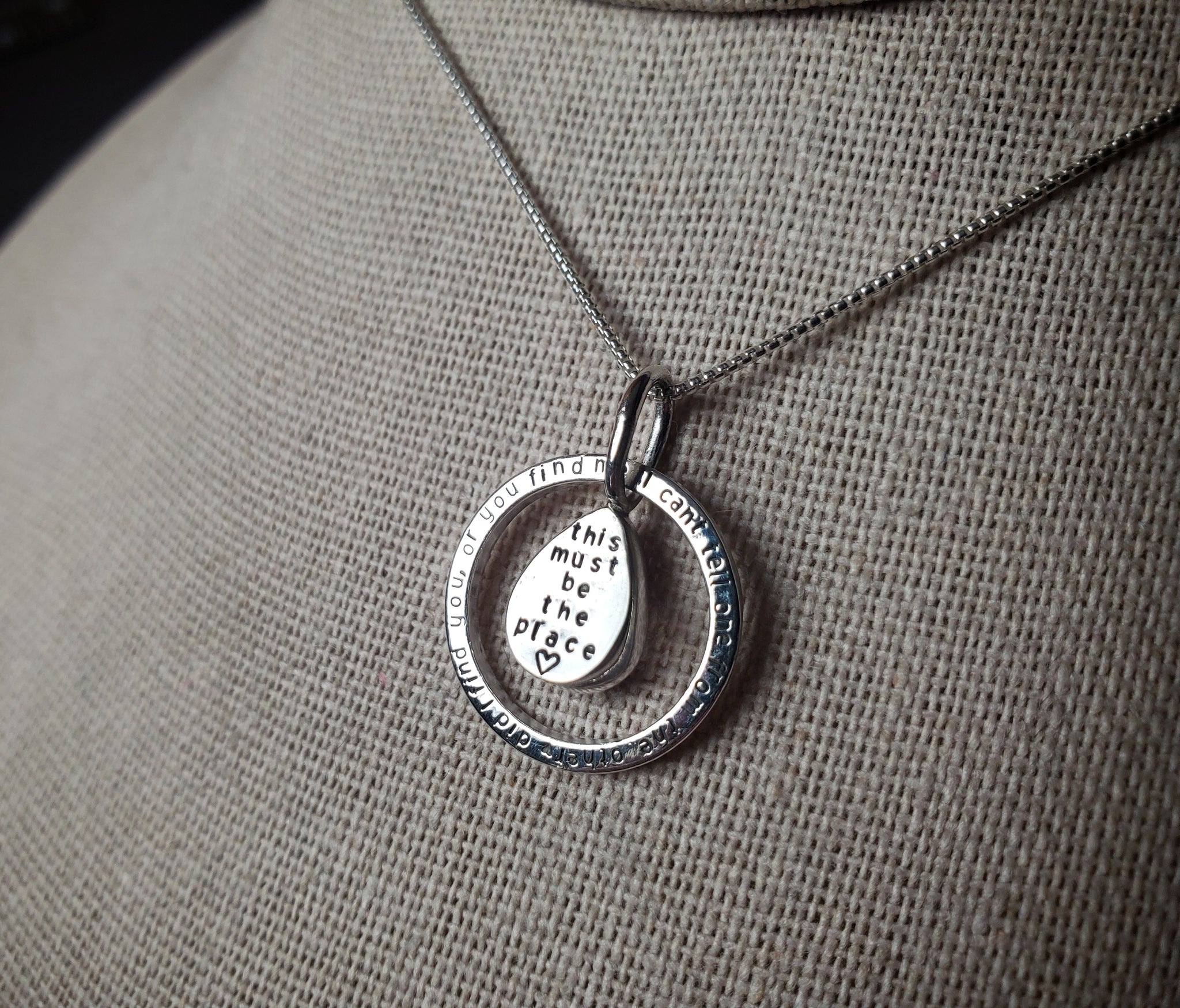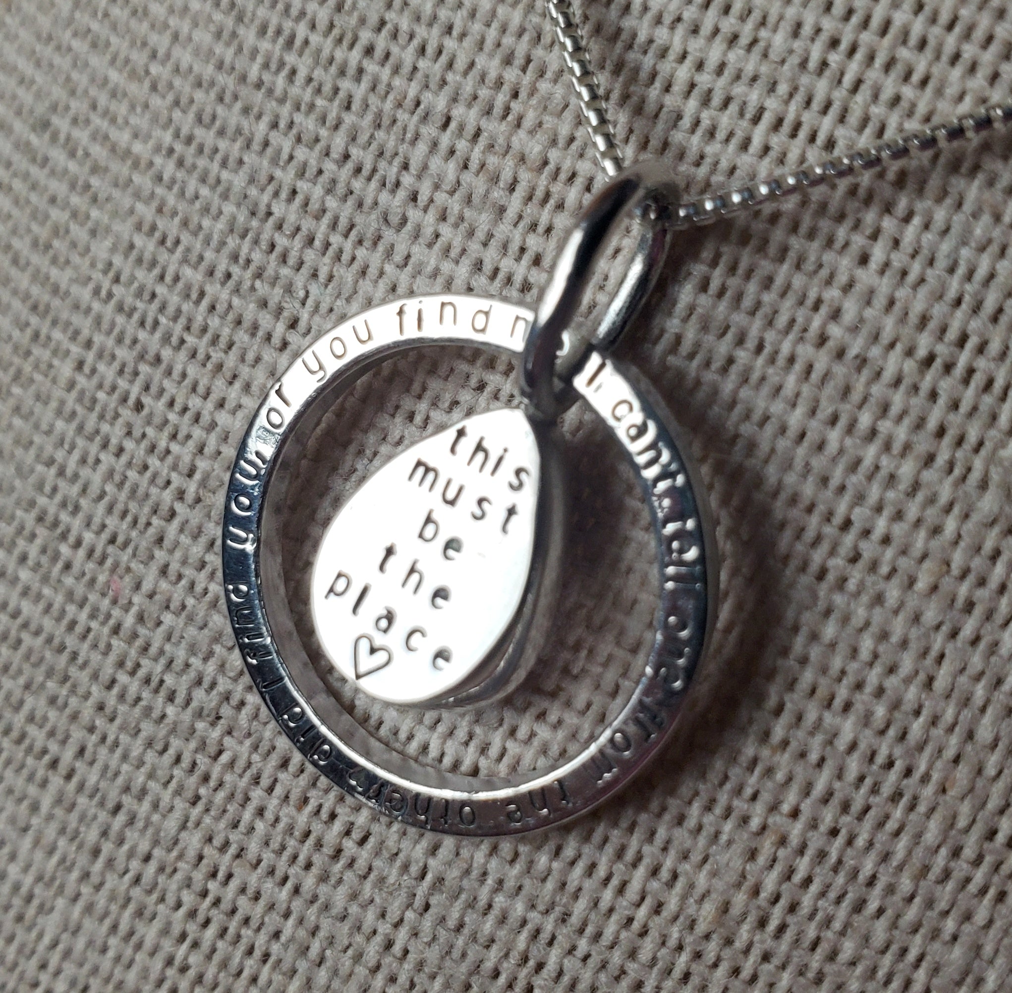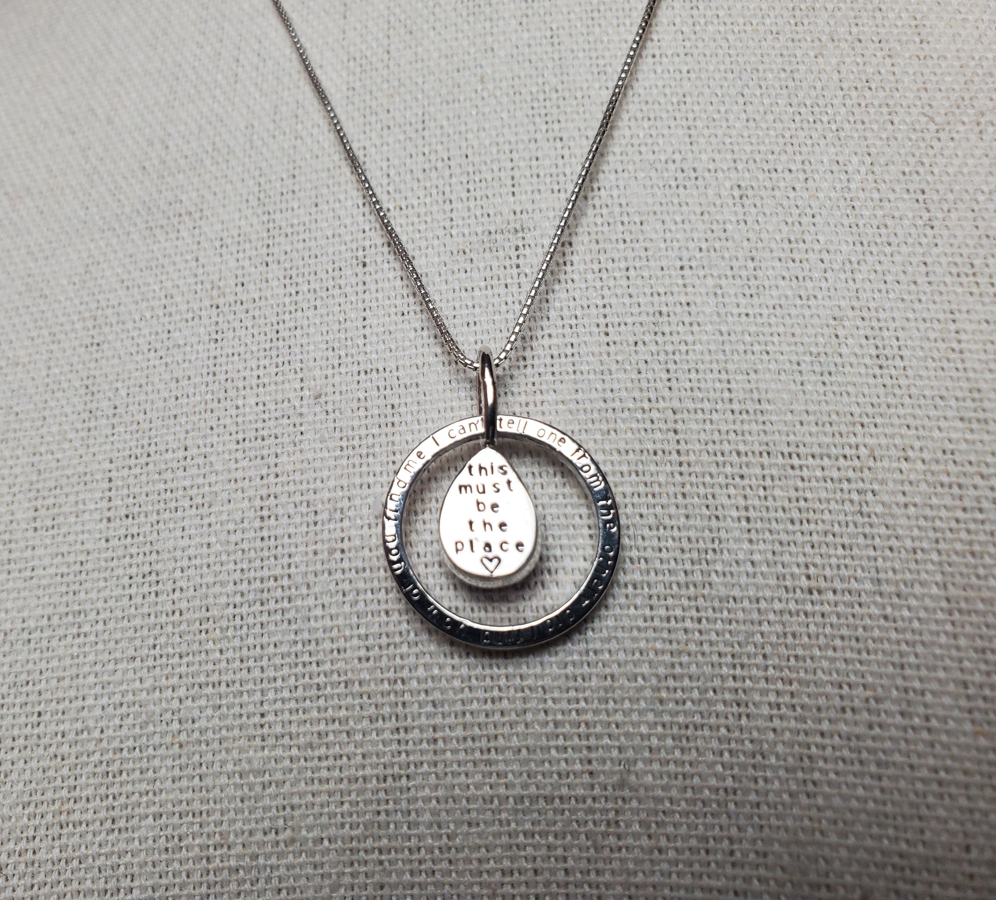 I've been saving this pink sapphire for such a long time and I'm so happy to finally see it set, and how beautifully it came together. The front has a hammered texture finish and the circular frame can spin through the bail. The backside has "this must be the place" and "I can't tell one from the other- did I find you, or you find me" done in a very challenging 1mm sized font. I just couldn't love it more!